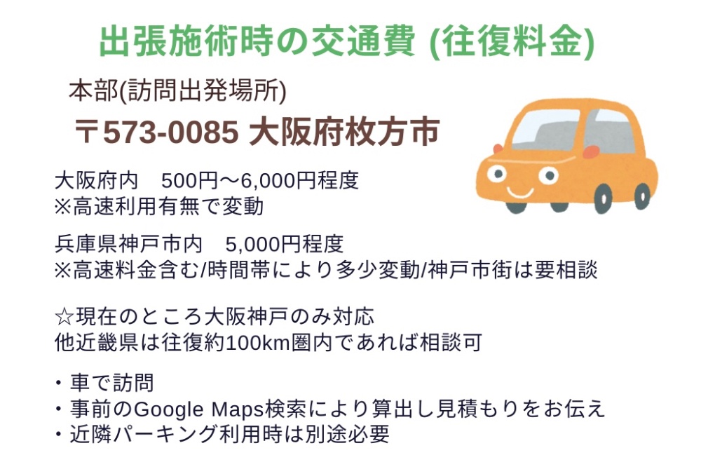 ・医療行為、性的サービス、違法行為は一切行いません。・既往歴や重度すぎる疾患の場合は、担当医師にご確認いただいた上でご予約お願いいたします。・ご予約金として往復交通費のみ、事前にお支払いいただきます。・当日のキャンセルについて基本的にご返金は致しかねます。ただし、やむを得ない事情でご予約時間の90分前までにご連絡をいただけた場合のみ、ご予約金はご返金致します。※その際に手数料がかかる場合は御負担いただきます。